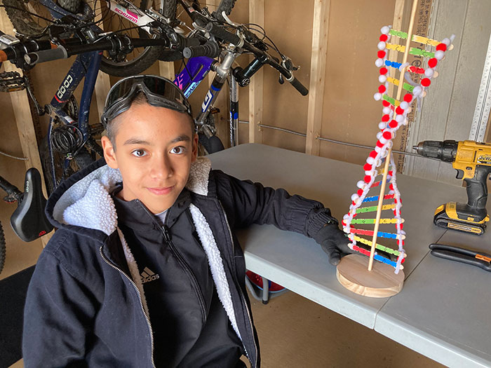This is a picture of me next to a model of DNA, in my shed.